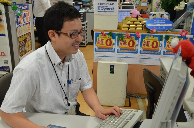 大学4 年生の12 月頃から入社前のOJTが始まりました。宅建の資格を取るための勉強会などもありました。私は賃貸事業のアパマンショップ松山北店で研修を受け、案内スタッフの手伝いからスタートしましたが、1 月からは特に繁忙期だったので、先輩の背中を見て覚えていたという感じでしたね。慣れるまでにはかなり時間もかかりました。入社して4 月からも同じ北店に配属され、引き続きルームアドバイザーの業務を行いました。その後、2 年半後に松山市駅前店に異動し、市駅前店では5 年半ほど働き、副店長・店長を経験しました。